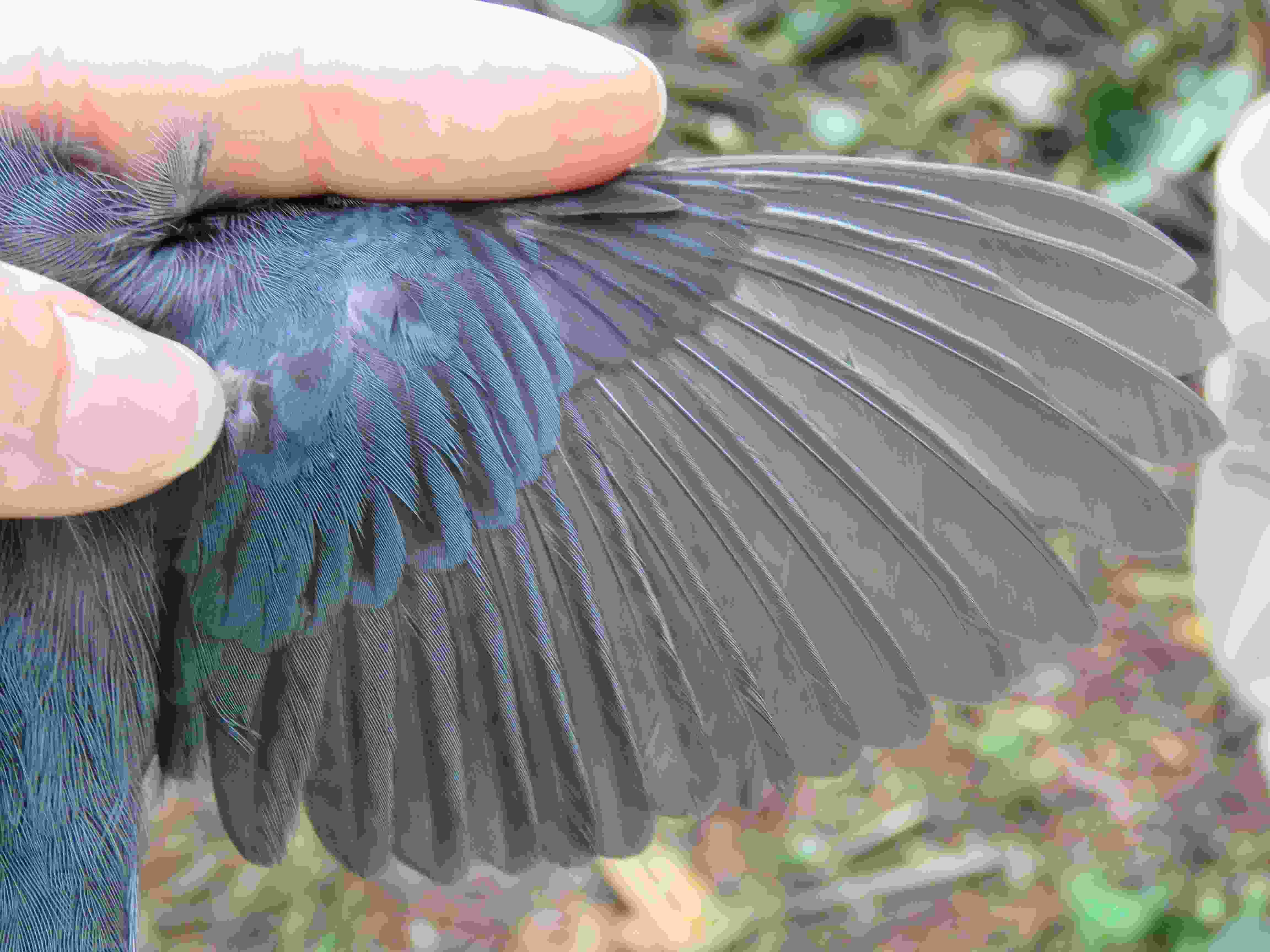 FCF - M: A plumagem formativa pode ser identificada pela presença de limites de muda entre penas juvenis e formativas. Os machos apresentam coloração azulada a preta cintilante, contrastando com as penas juvenis remanescentes, de coloração marrom e menor qualidade. Os limites podem ser encontrados nas grandes ou médias coberteiras, nas penas primárias ou secundárias e, ocasionalmente, nas alulas.