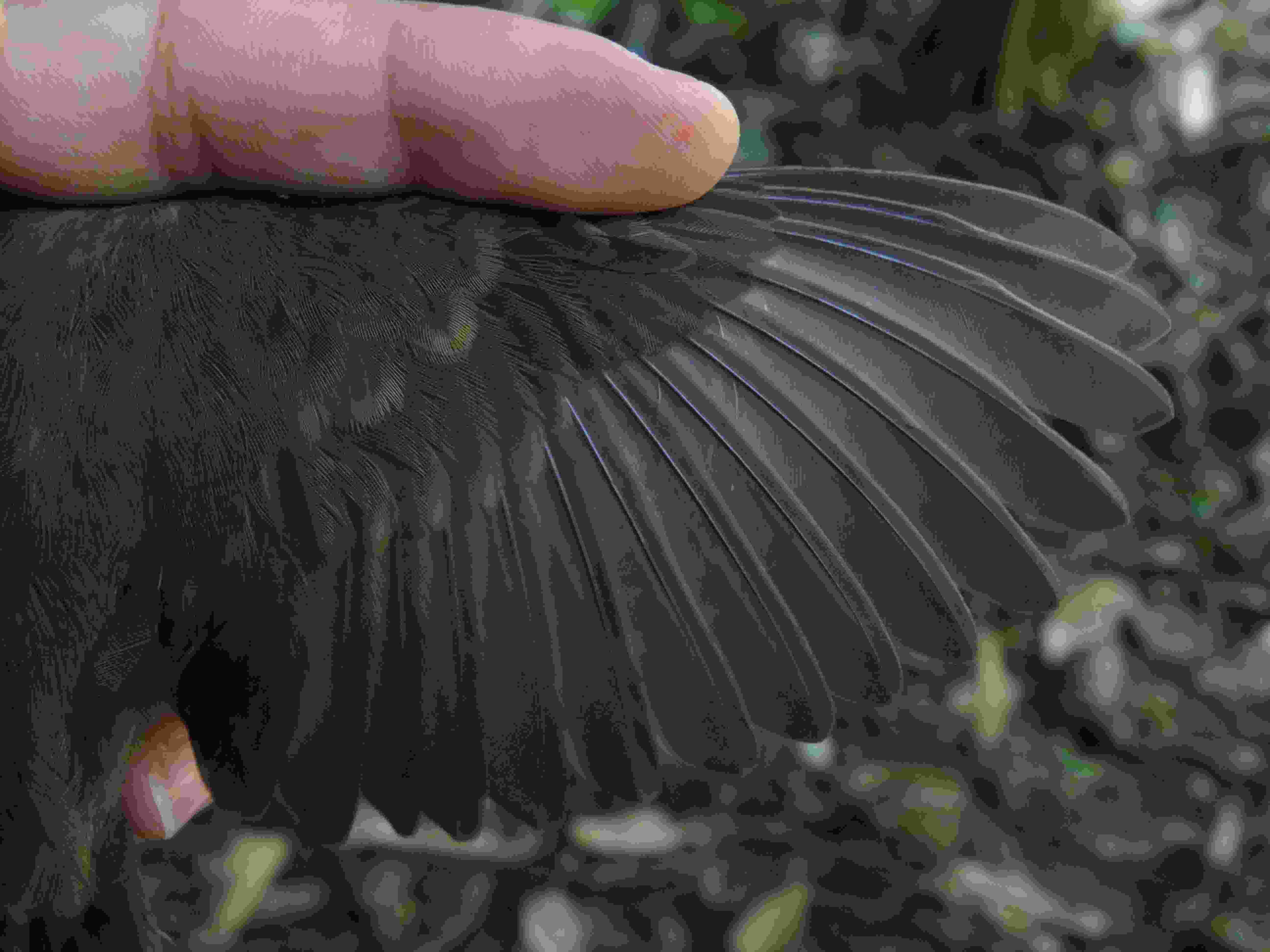 DCB - M: Penas uniformemente pretas-azuladas brilhantes, sem limites de muda aparentes. As penas possuem boa qualidade e a cauda apresenta formato mais largo e quadrado.