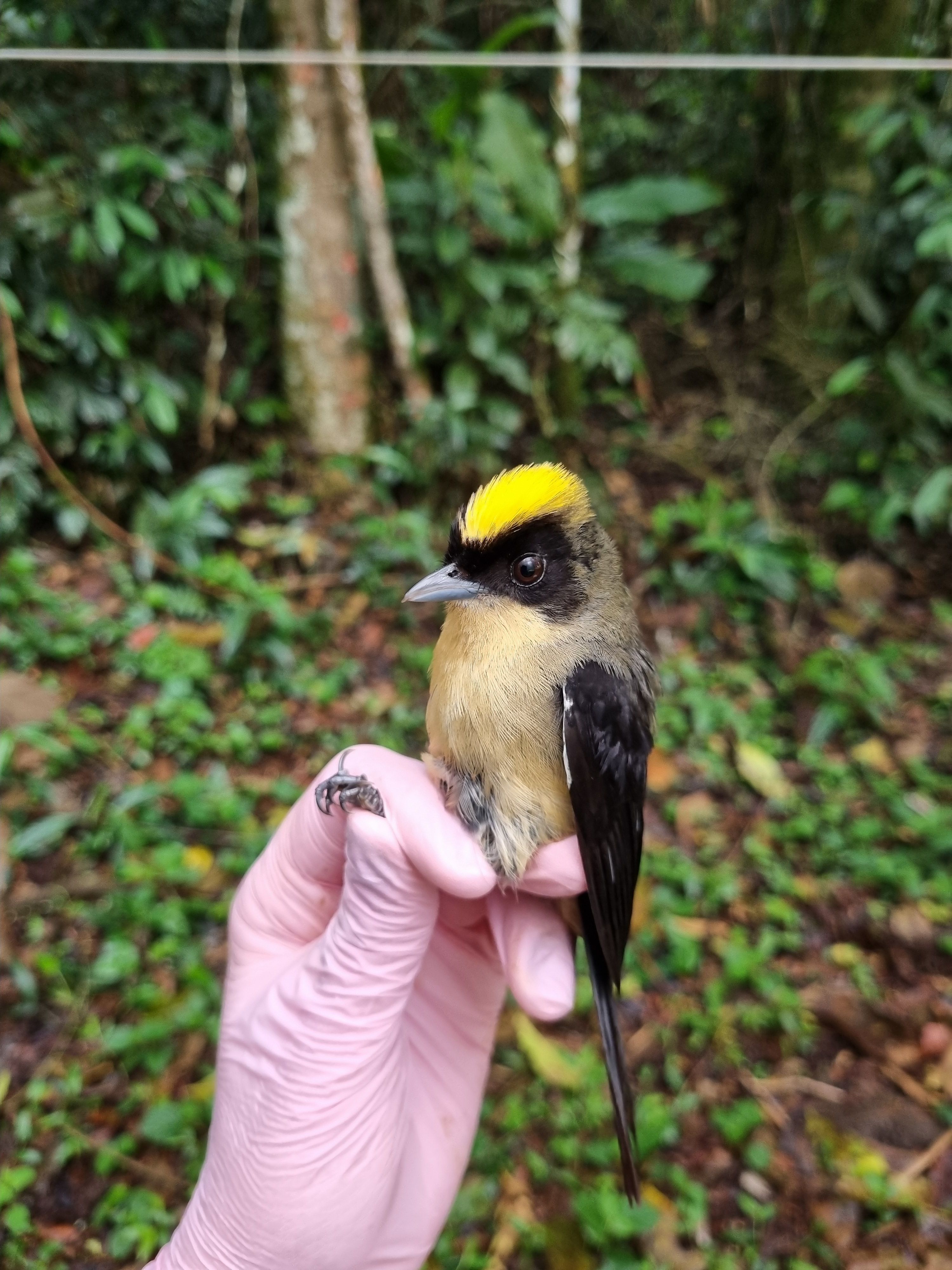 DPB - M: Indivíduo trocando penas do corpo e da asa. A muda é simétrica e pode estar em fase intensa ou nas etapas inicial/final, com alguns canhões ainda aparentes. Observa-se contraste entre penas velhas e penas novas do ciclo definitivo básico. Apresenta máscara preta e coroa amarelo-brilhante.