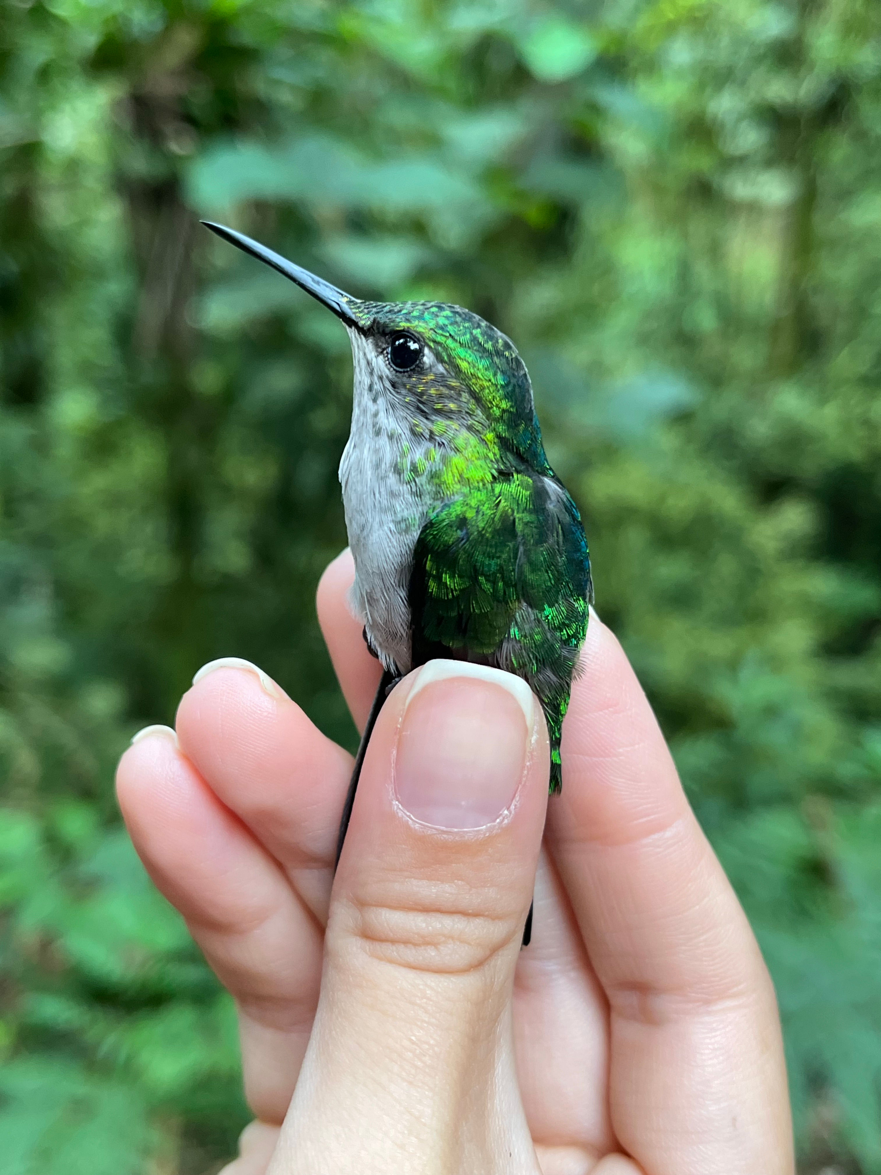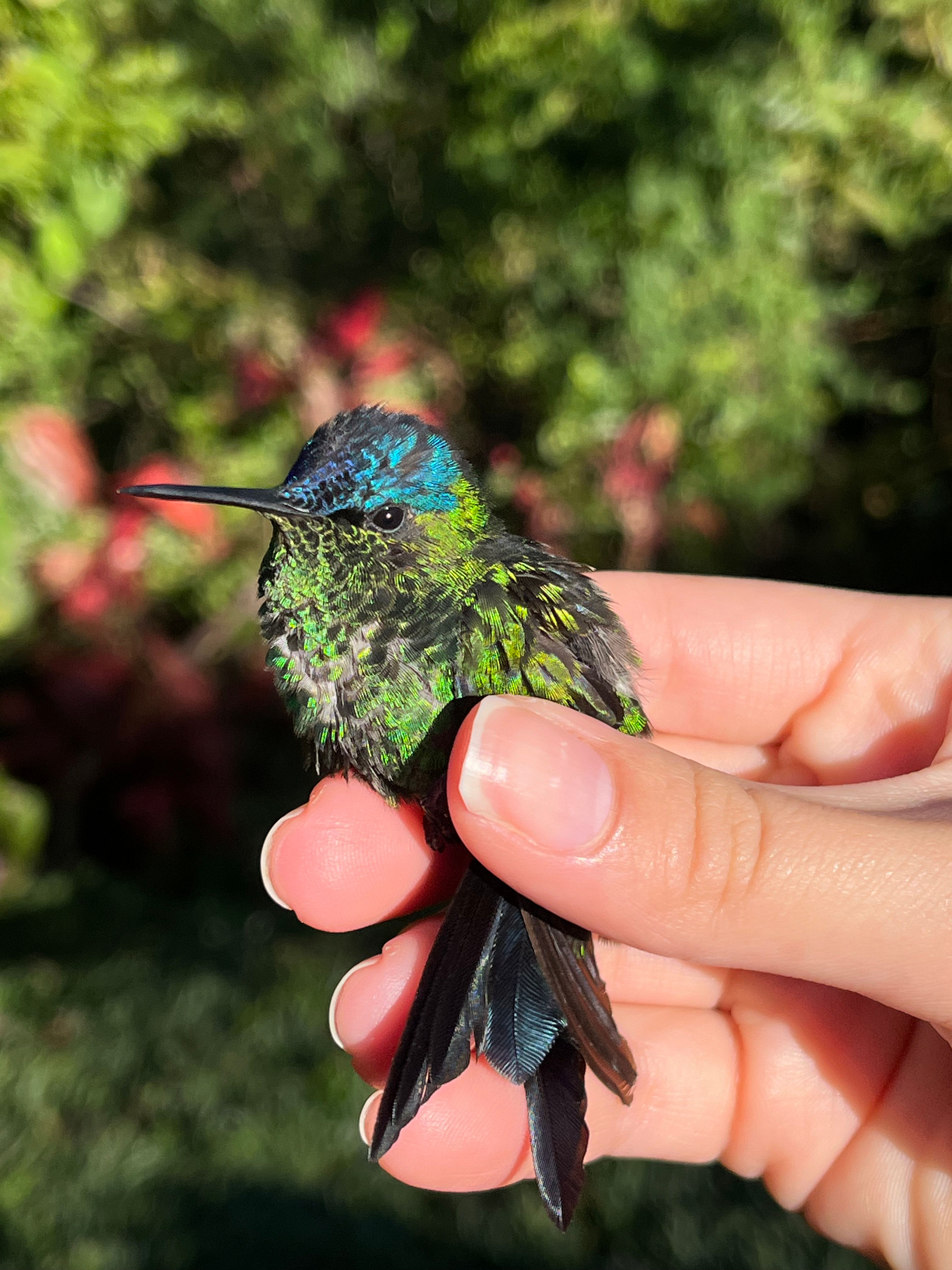 FPJ - U: Não temos dados nesta classe de idade para a espécie no OAMa. Mas de forma geral, o esperado para identificar essa classe de idade seria observar as penas rêmiges crescendo todas ao mesmo tempo e presença de >75% de corrugação de bico. Além disso, penas com características de juvenis, que em beija-flores em geral se caracteriza por uma borda acobreada.