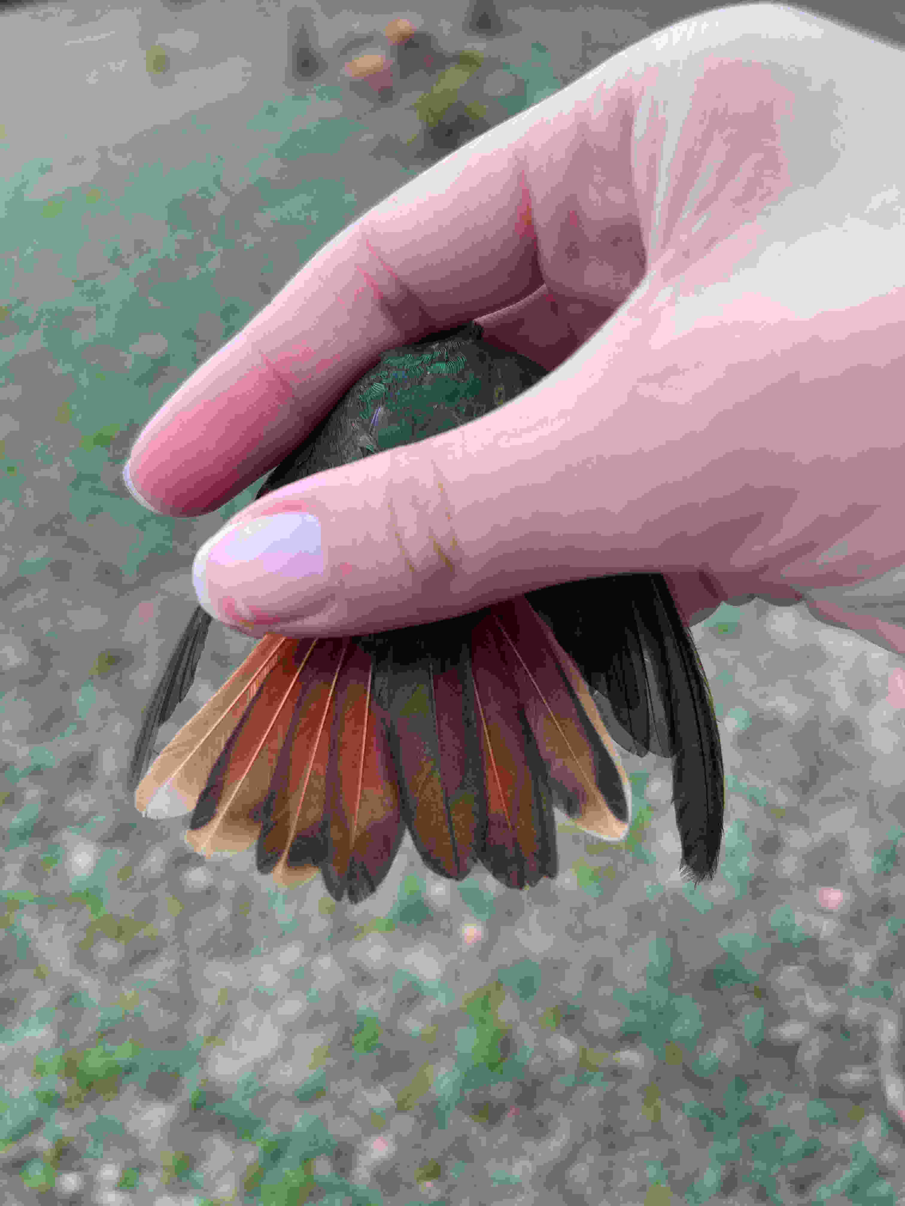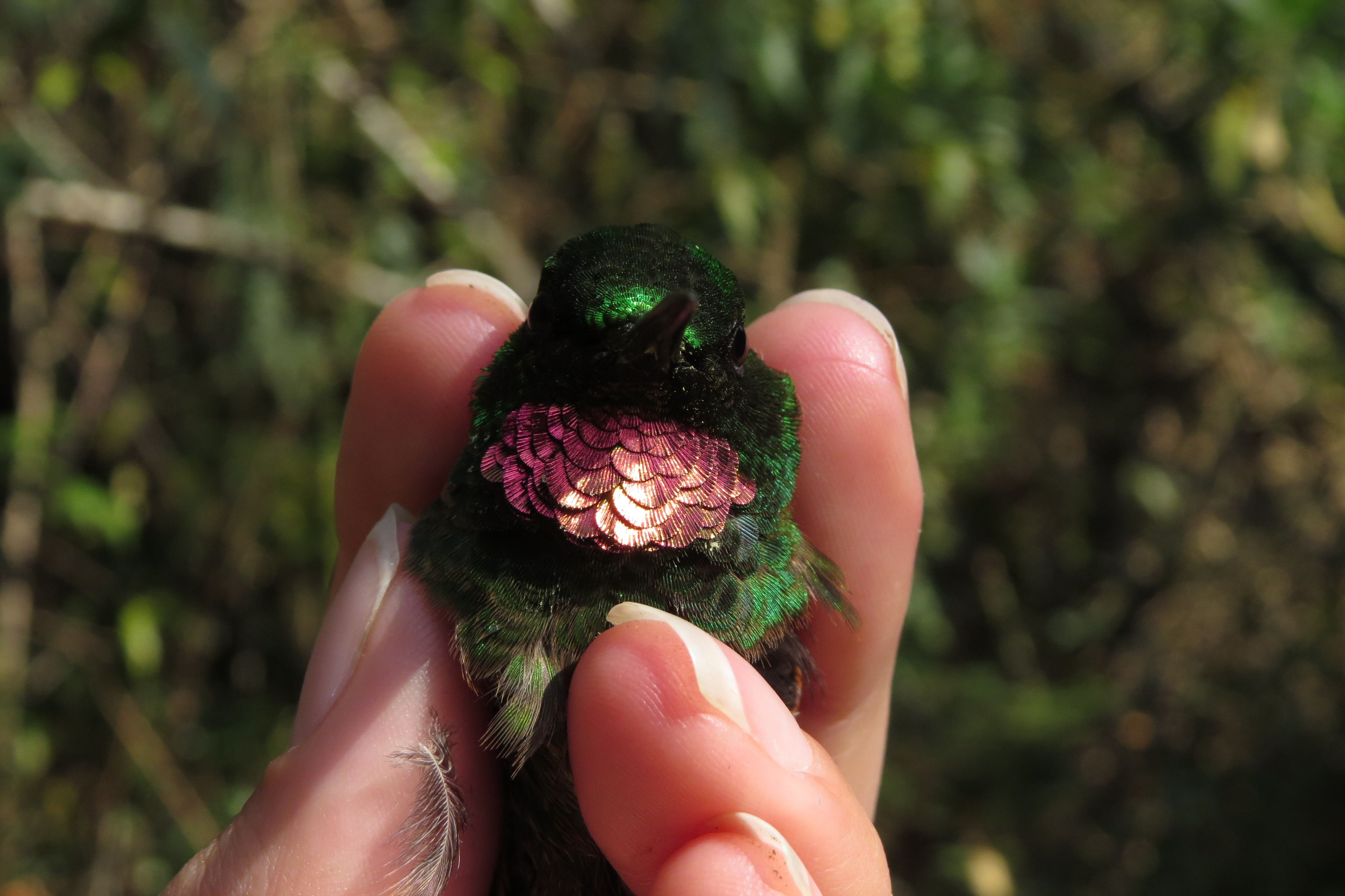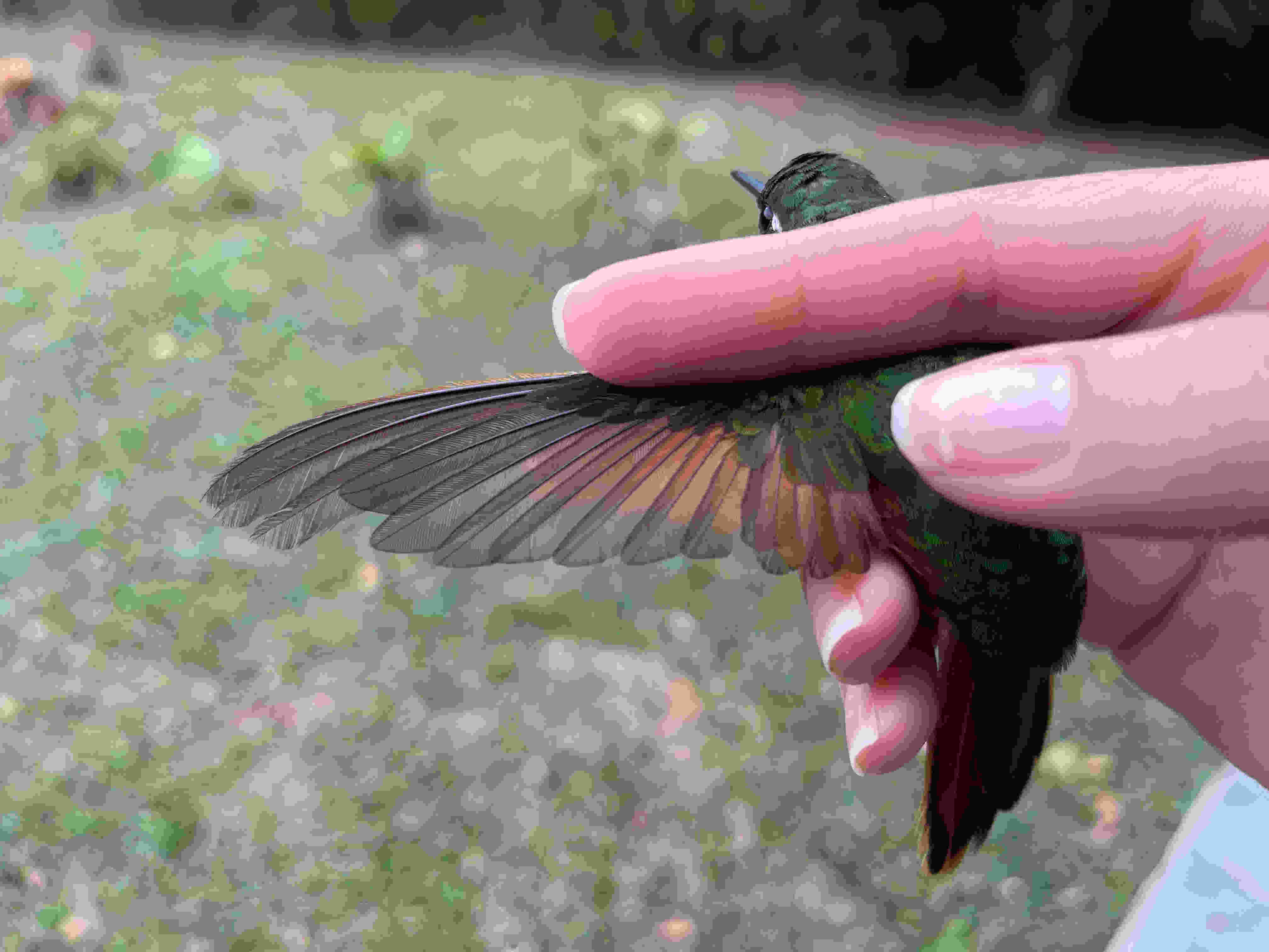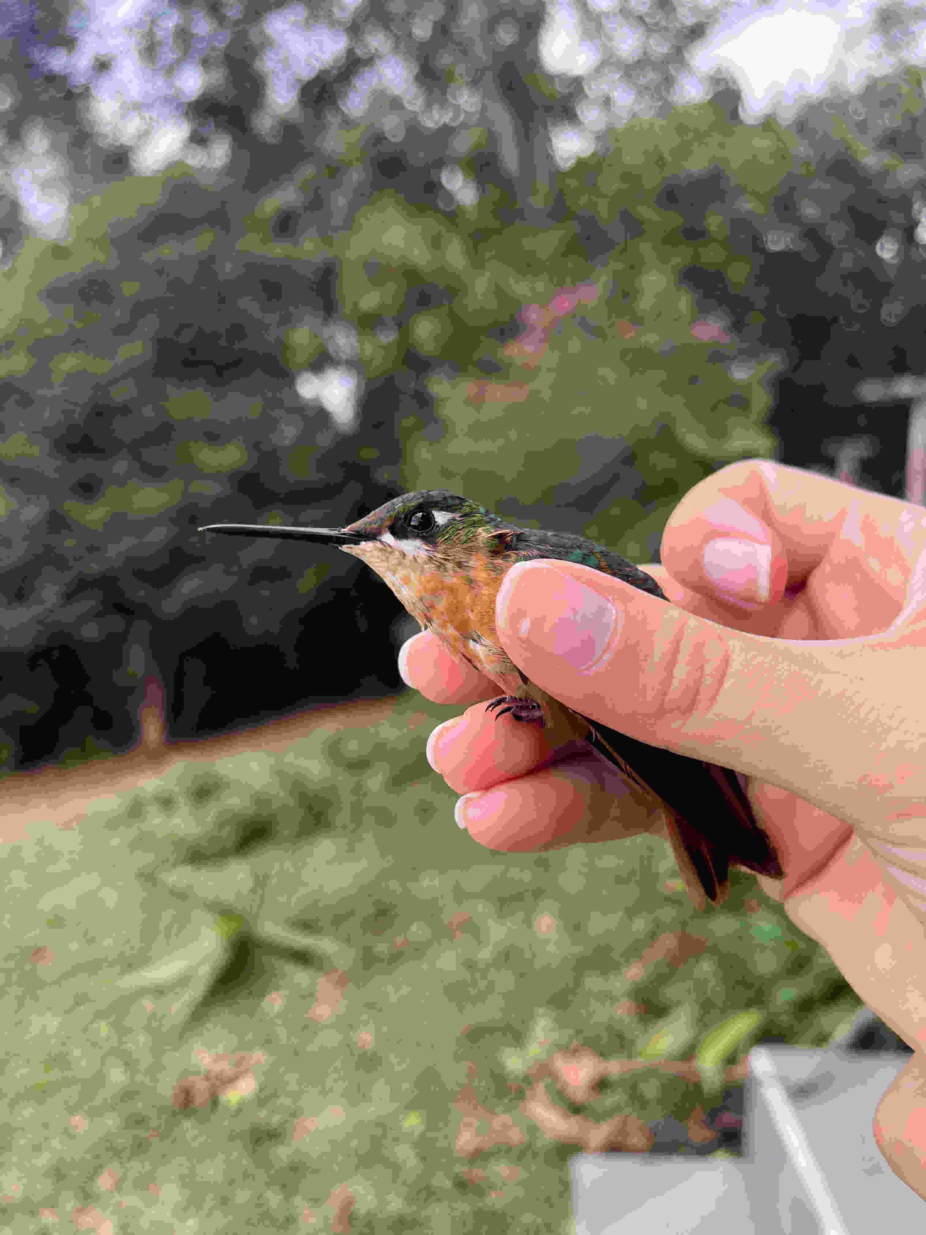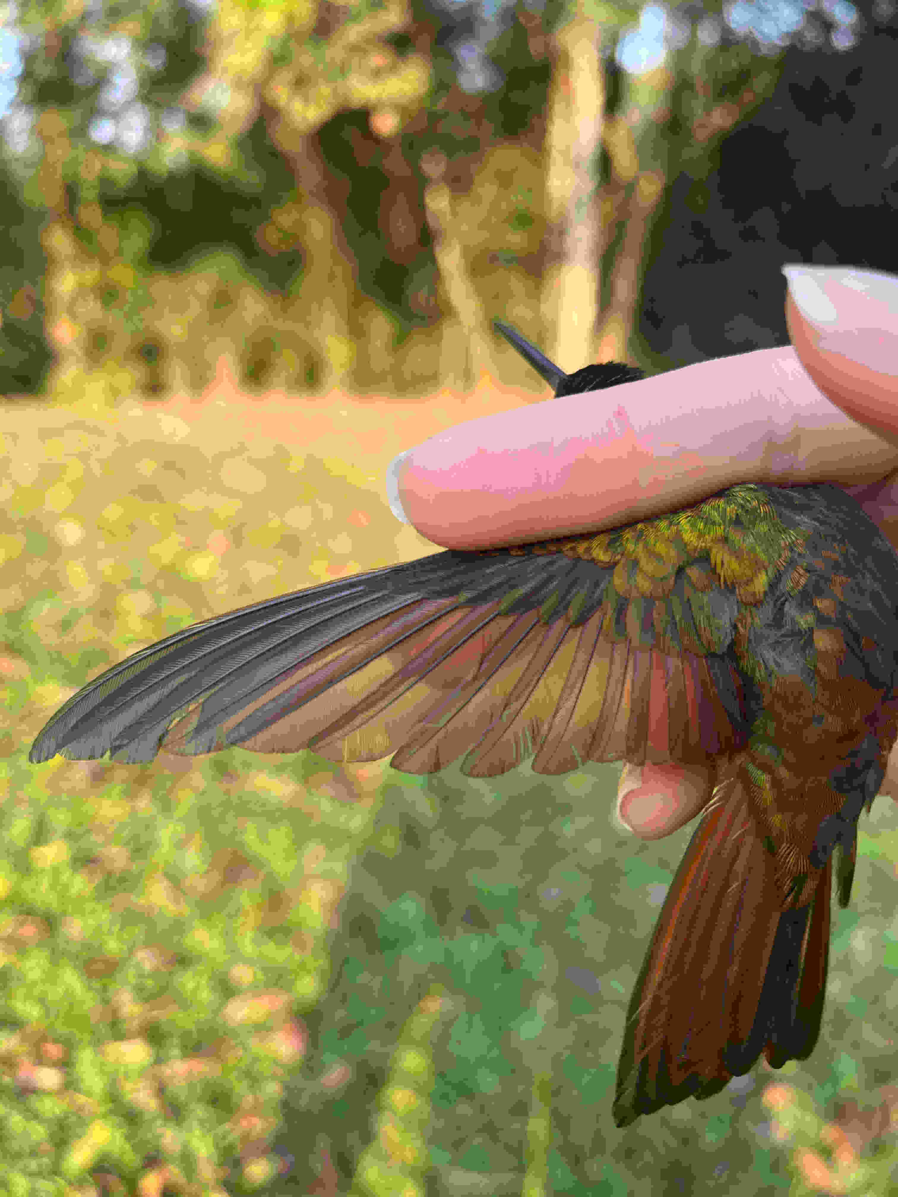 FCJ - U: Não temos dados nesta classe de idade para a espécie no OAMa. Presença de >75% de corrugação de bico. Além disso, penas com características de juvenis, que em beija-flores em geral se caracteriza por uma borda acobreada.